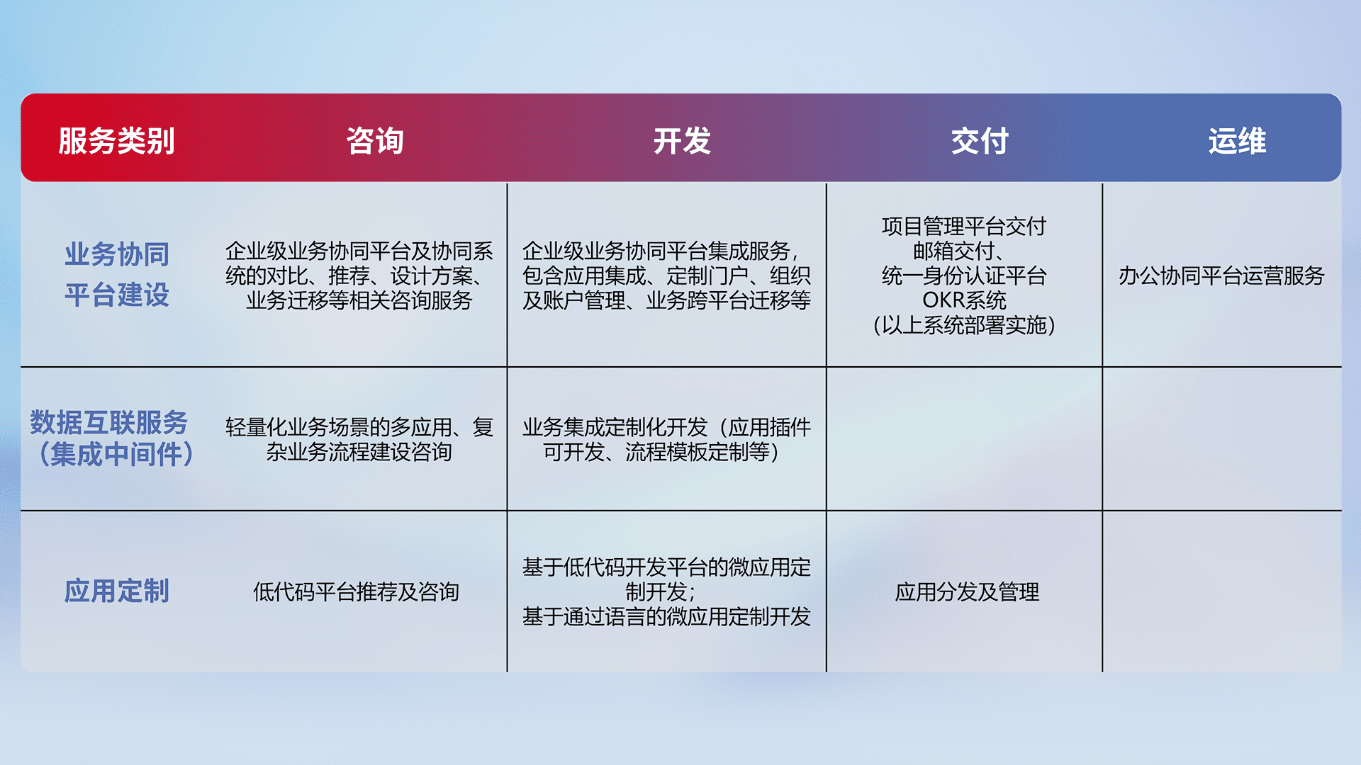 针对钉钉、、、、企微、、、IDaas等平台级产品提供产品的规划、、、、方案、、、、交付、、、定制化开发等服务,,实现如统一协同办公、、、、智能客户服务、、、混合会议管理、、、、智能数据查询、、、、等业务场景,,实现数字化转型。。。。