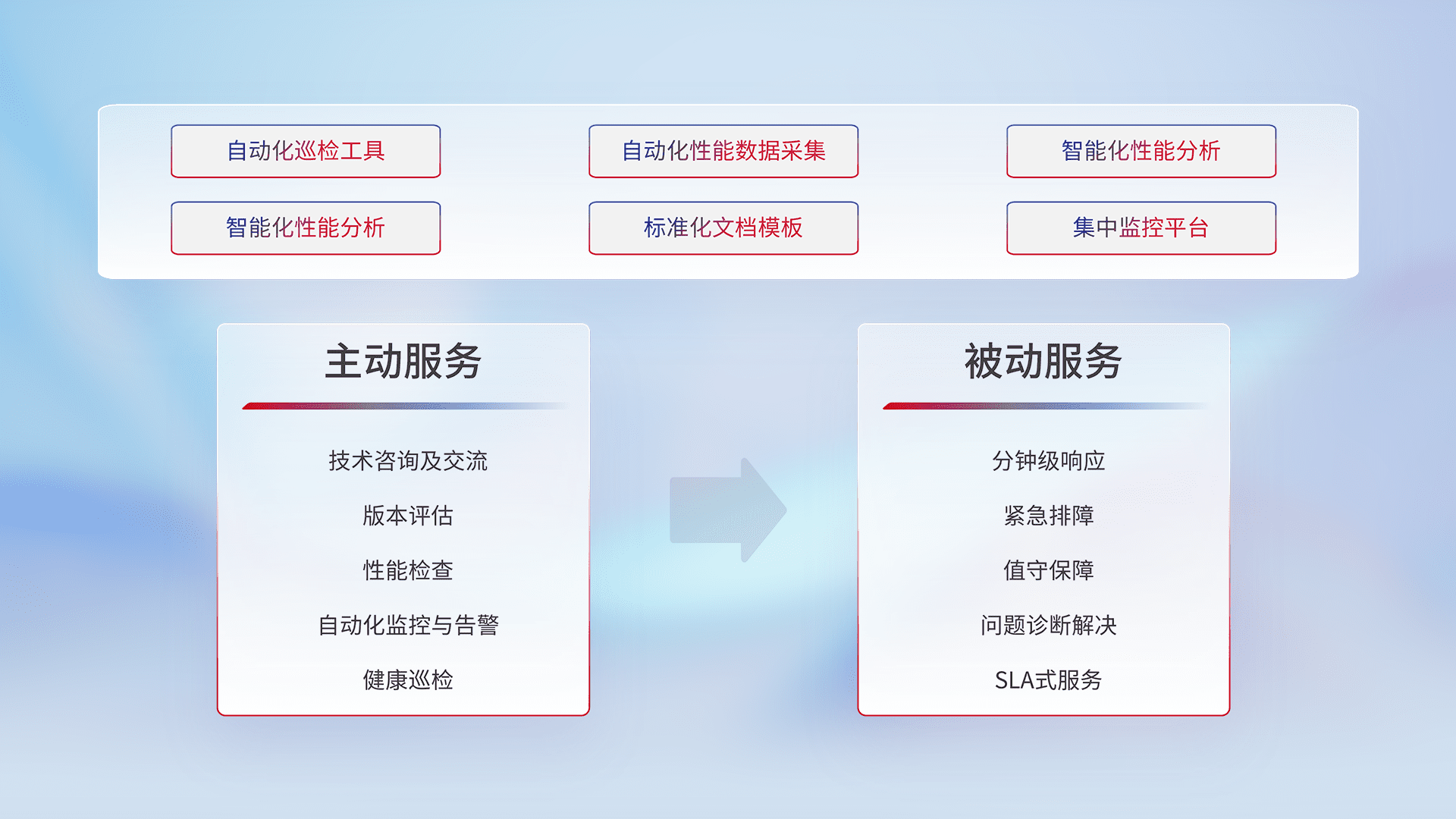 智能化工具和标准化文档,,保障服务质量,,,提供主动服务(包含技术咨询、、、版本评估、、、、性能检查、、、自动化监控与告警、、、健康巡检)和被动服务包含(分钟级响应、、、、紧急排障、、、值守保障、、问题诊断解决、、、SLA服务)。。